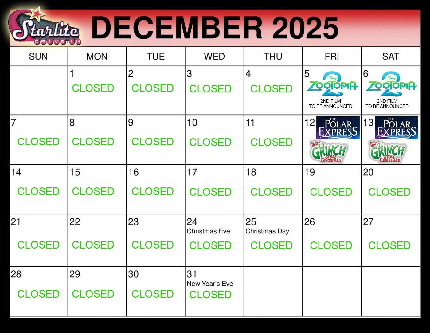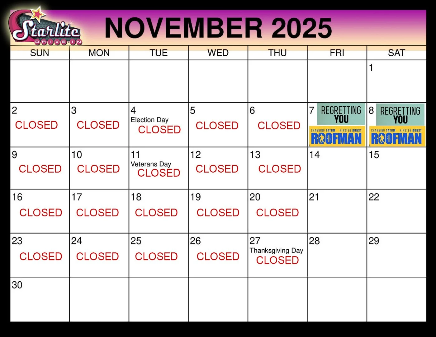 8/25/25: The Starlite Drive-In is now closed Monday-Thursday.