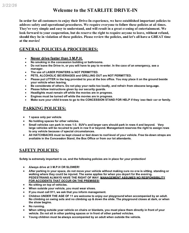 Food Permit Policy: There is a $10.00 food permit (per car) for bringing in food & drinks from elsewhere. At the bottom, you receive a $2.00 discount on the purchase of a Large Hot Buttered Popcorn at the Snack Bar! To redeem, just show your same-day permit to a cashier. Our food sales are the life line of success!